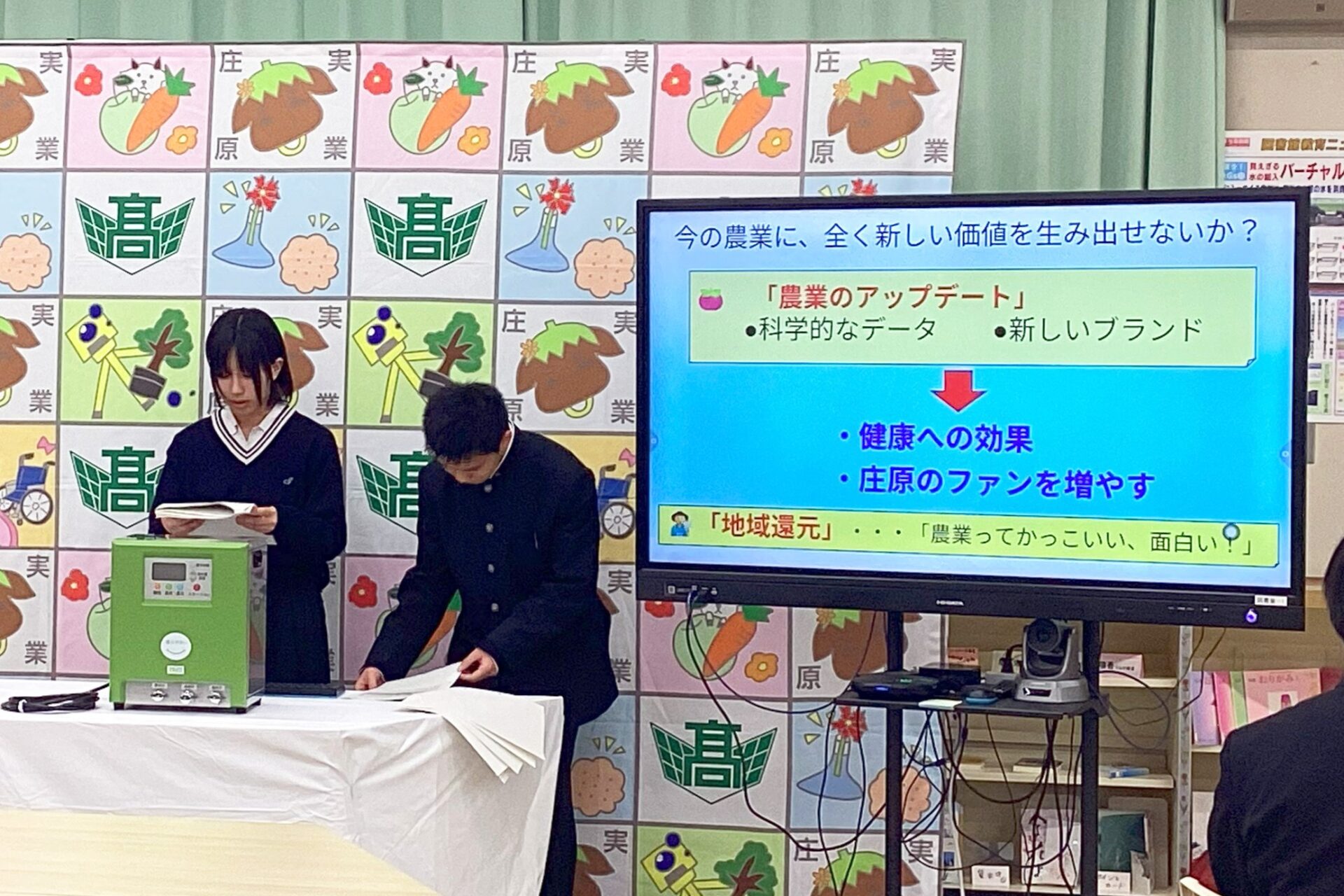 当日は、学生および教職員が見守る中、農業用電解水素水整水器「AG-10」が3台贈呈されました。生徒たちからは、ぶどうやトマトなど栽培予定の作物のほか、電解水素水の活用方法や期待する変化などを発表しました。